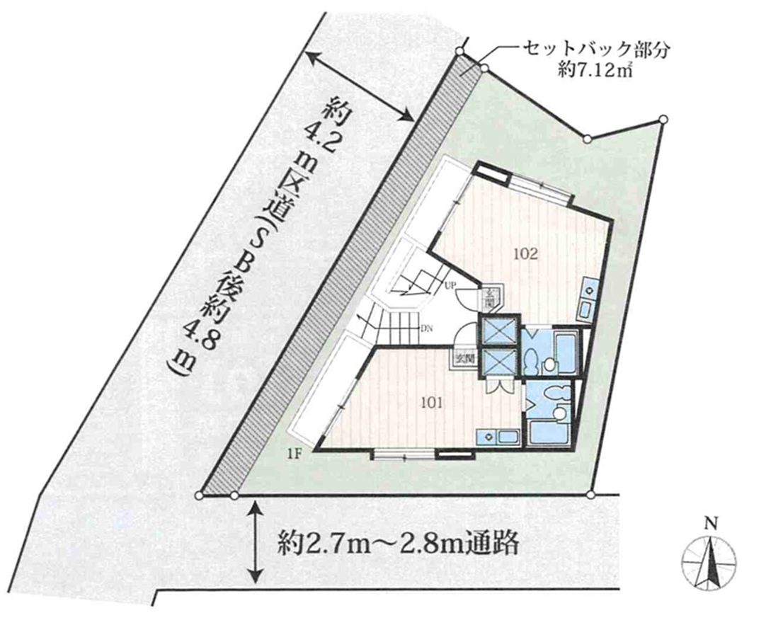 | 接道状況 | 西側約4.2m区道(セットバック後約4.8m)・南側約2.7~2.8m通路 | 私道負担面 | |